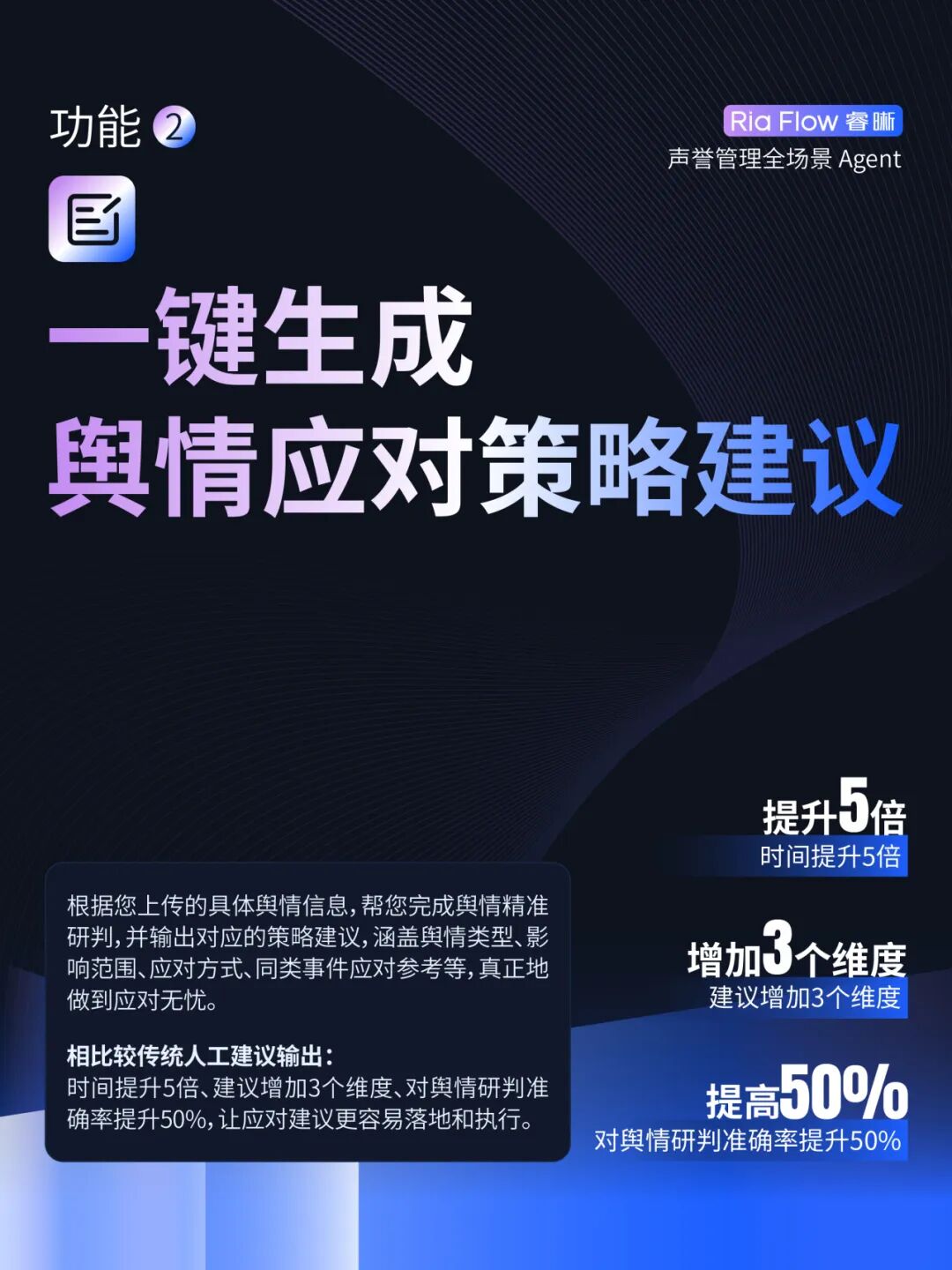 以前人工出策略,可能要开几小时会、查半天资料,还容易受主观判断影响。而Ria Flow睿晰的应对建议,不仅生成速度提升5倍,还能从30个更多维度给出参考,研判准确率提高50%,让你应对舆情时心里有底,不再盲目。