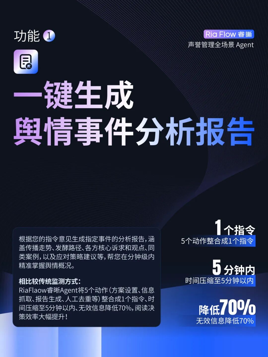 Ria Flow睿晰覆盖舆情的研判、分析和应对三大核心场景,通过AI技术实现从数据筛选到策略生成的全流程自动化,六大核心功能精准匹配日常需求: