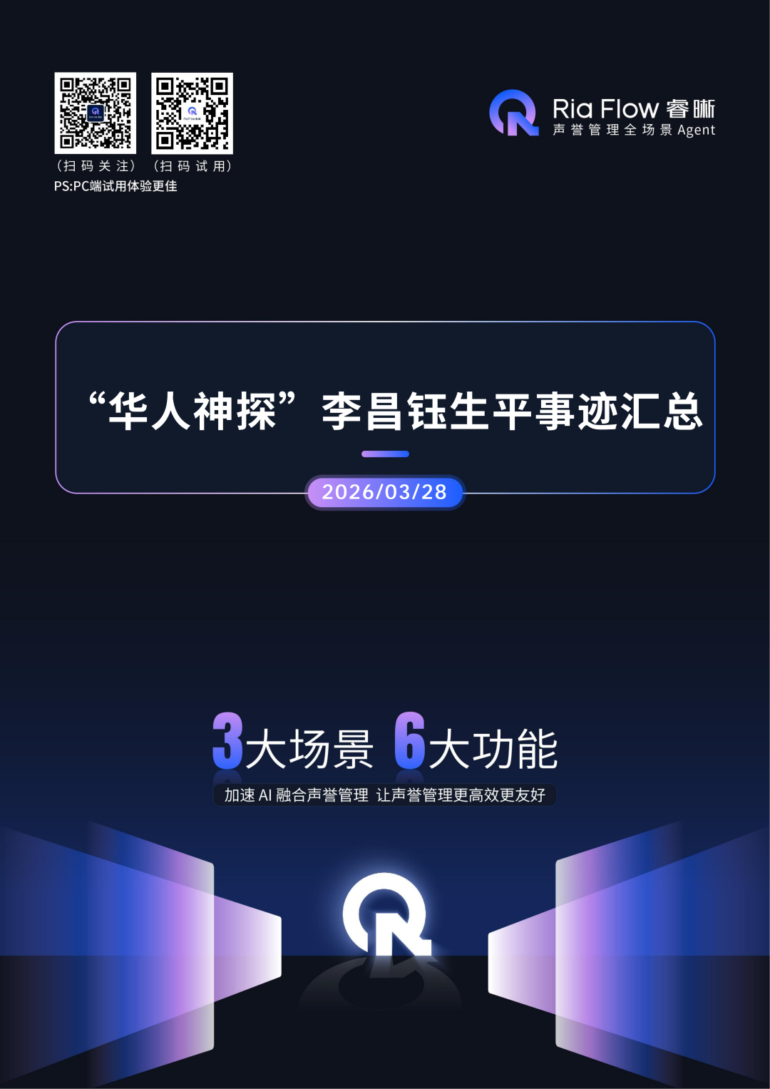 作为声誉管理全场景Agent,Ria Flow睿晰依托声誉事件分析功能,快速输出《“华人神探”李昌钰生平事迹汇总》完整报告,以下为核心内容呈现:
