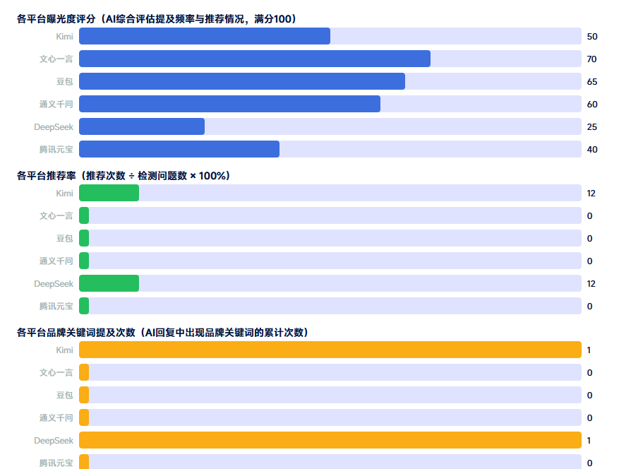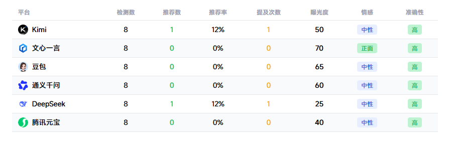共检测豆包、Kimi、DeepSeek、文心一言、通义千问、腾讯元宝6个AI平台,发送48个问题,品牌被推荐2次,关键词总提及 2 次。具体展现情况如图所示: