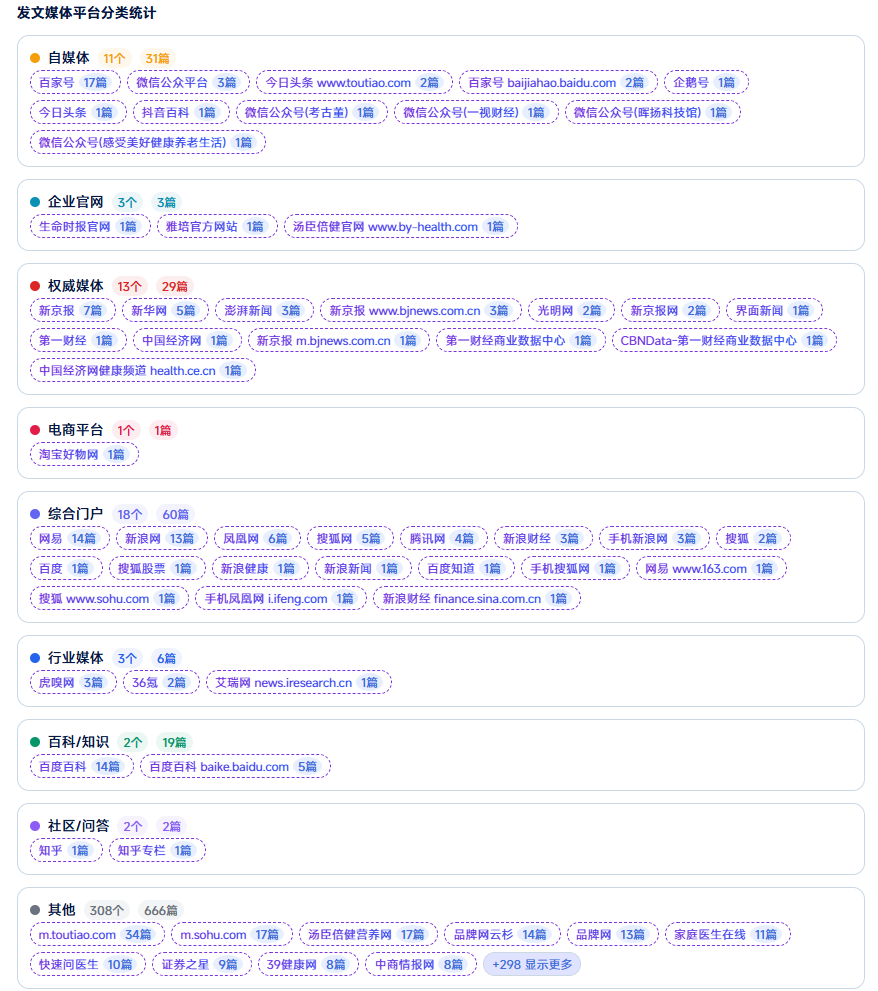 本次统计中泛资讯类占比超八成,权威媒体、行业媒体整体占比偏低,自媒体中百度系百家号占比最高,百科类以百度百科为主,品牌官方内容已有一定曝光,权威专业内容供给仍有较大提升空间。(索引链接较多,此处仅展示部分内容,可点击原文查看PDF文档,或直接登录睿晰生成洞察分析报告)