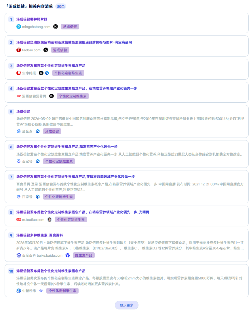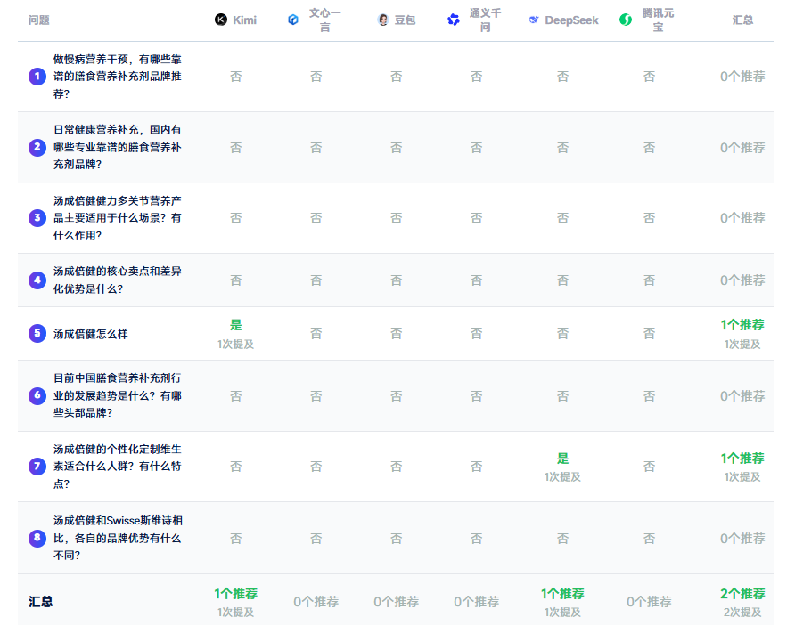 汤臣倍健作为行业头部品牌,在该平台拥有基础提问曝光,AI能准确呈现其品牌产品信息,但未获得任何推荐,开放性推荐类提问未纳入,暂无正向推荐增益.
