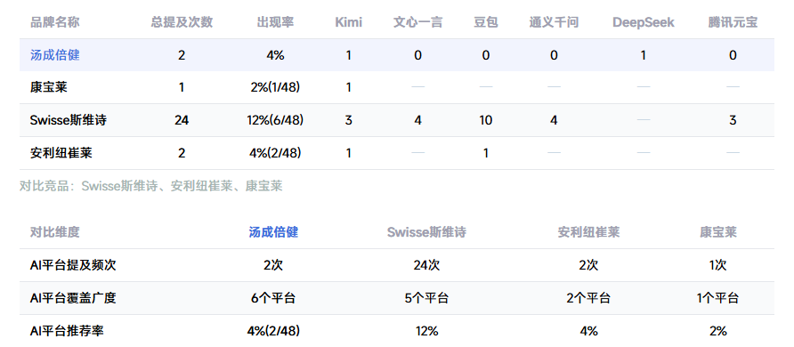 AI平台整体声量极低,总提及次数远低于头部竞品Swisse斯维诗,曝光严重不足;