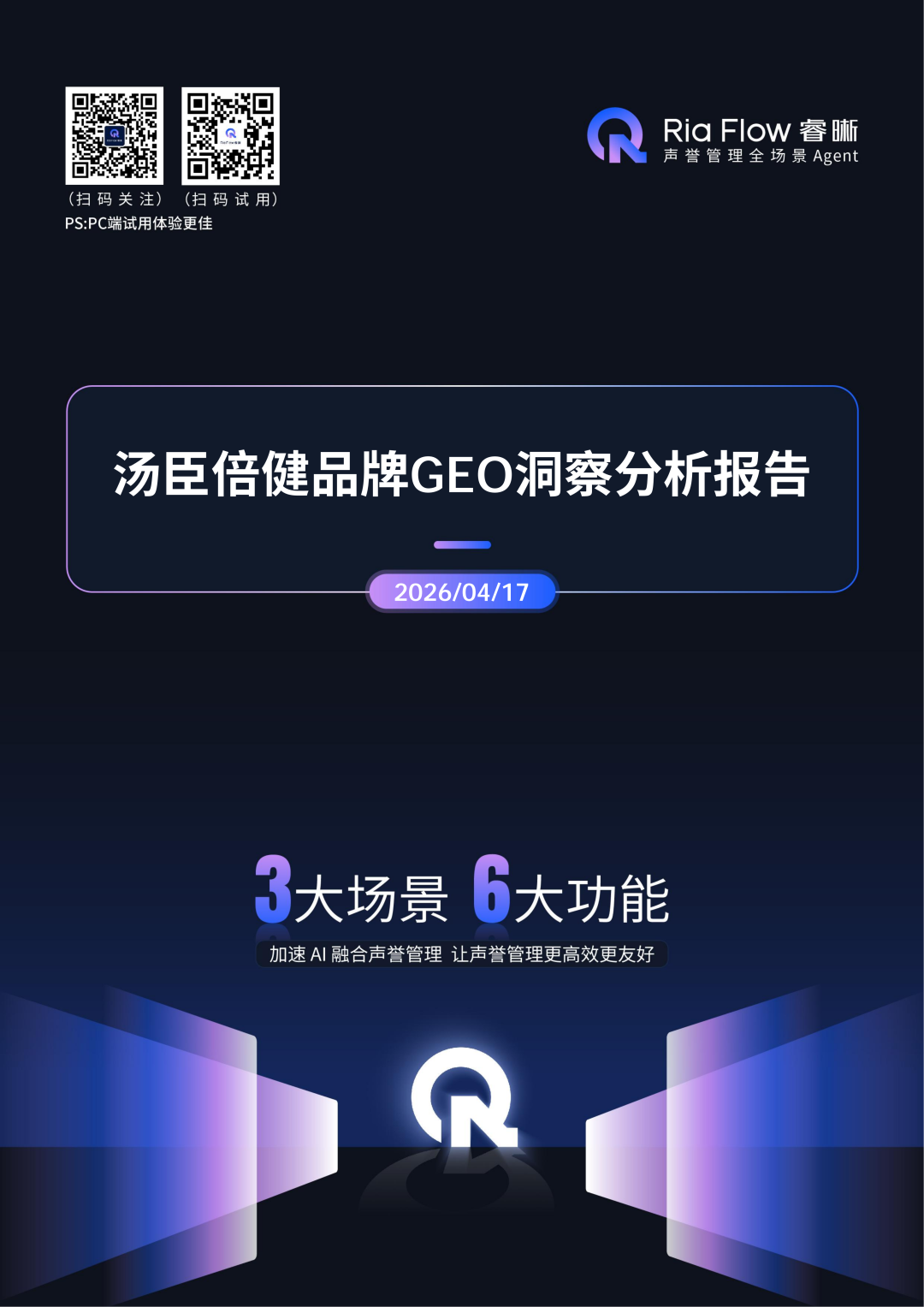 RiaFlow睿晰依托GEO洞察分析功能,一键生成汤臣倍健品牌在主流AI平台的深度分析报告,从品牌基础评估、六大AI平台表现、竞品对比、索引来源及优化建议五个维度,系统呈现客观数据与专业分析结论。以下为报告核心内容: