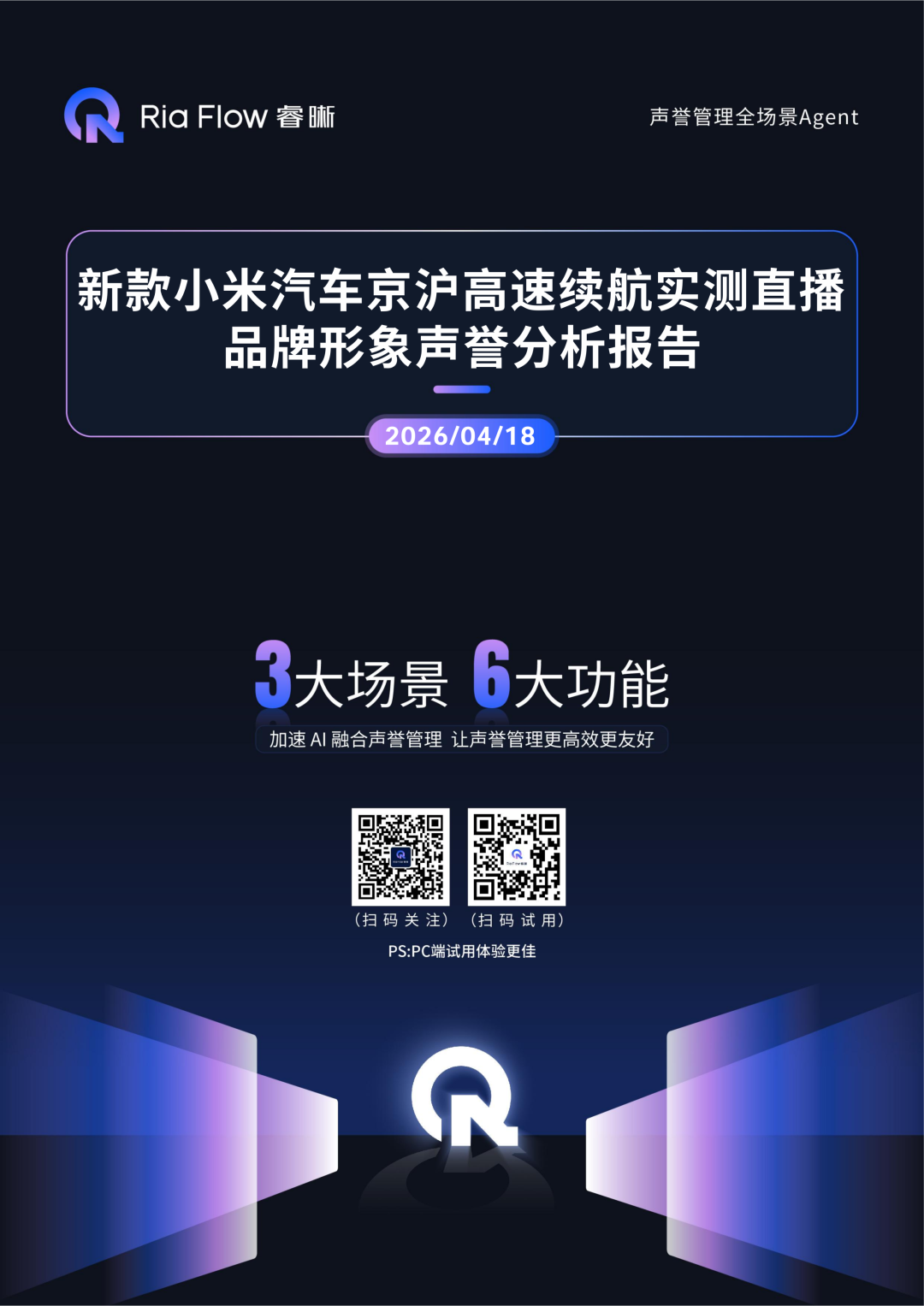以上报告内容由RiaFlow睿晰一键生成。点击阅读原文即可获取完整版文档!想要全面了解自身品牌的声誉现状、提前排查潜在舆情风险?可通过下方海报扫码免费领取专属品牌声誉分析报告,报告覆盖品牌声量、平台声誉健康度、核心美誉度、针对性优化建议等7个维度内容,3 分钟即可看清品牌真相!