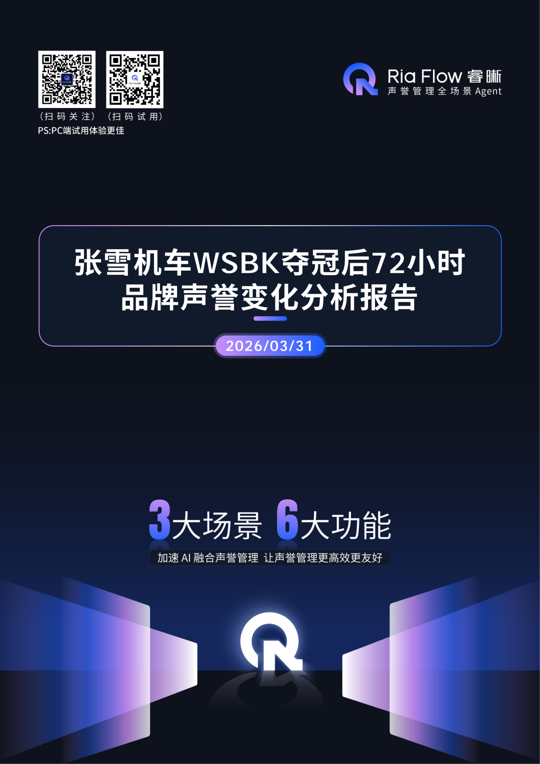 作为声誉管理全场景Agent,Ria Flow睿晰依托品牌声誉分析功能,一键生成《张雪机车WSBK夺冠后72小时品牌声誉变化分析报告》,围绕本次事件的传播链路、声量变化、平台声誉健康度、利益相关方感知、美誉度损伤等核心维度,进行全面、客观的拆解与分析,还原本次危机对罗技品牌声誉的深层影响。以下为核心内容呈现: