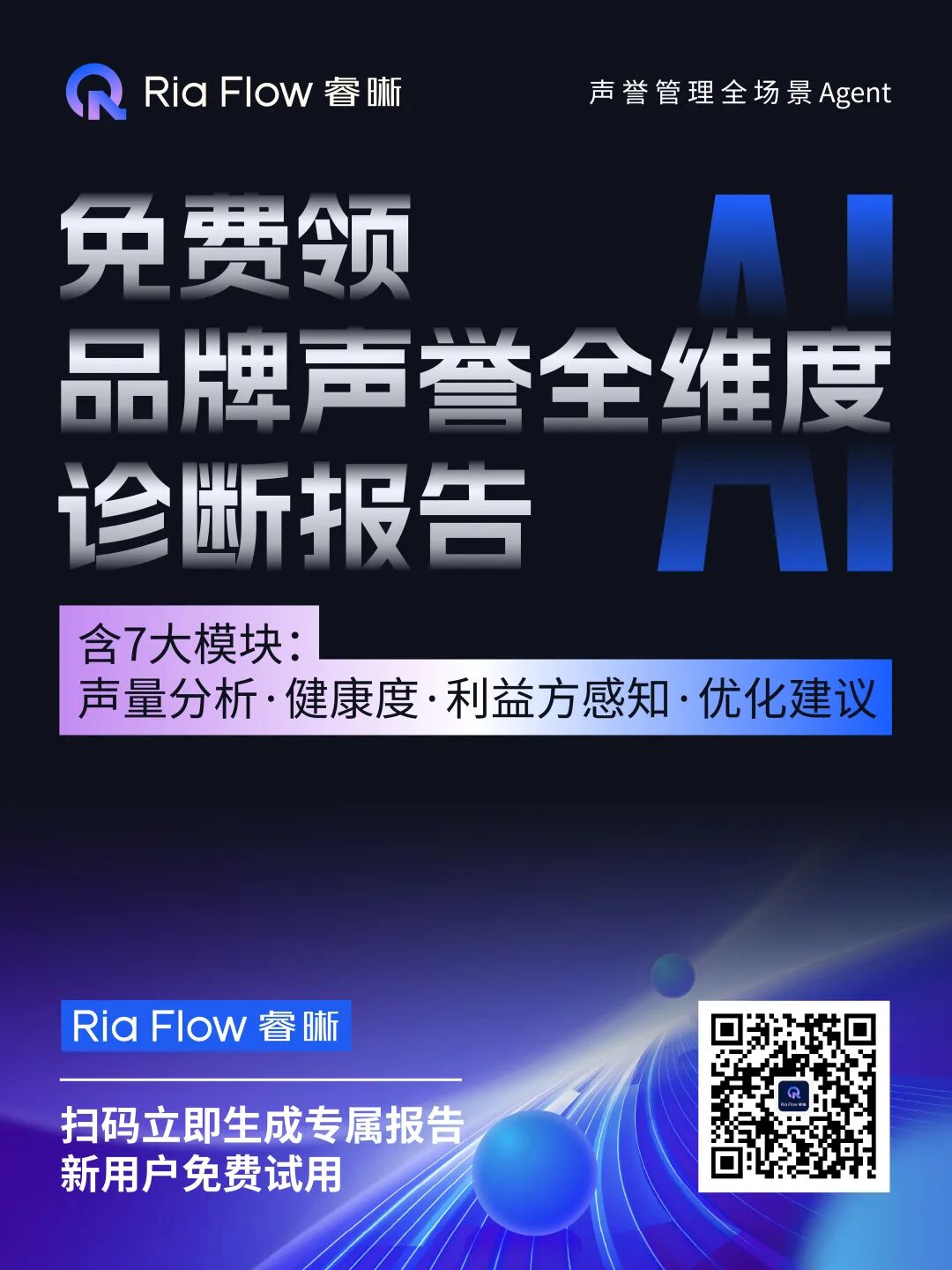 以上报告内容由RiaFlow睿晰一键生成。点击阅读原文即可获取完整版文档!想要全面了解自身品牌的声誉现状、提前排查潜在舆情风险?可通过下方海报扫码免费领取专属品牌声誉分析报告,报告覆盖品牌声量、平台声誉健康度、核心美誉度、针对性优化建议等7个维度内容,3 分钟即可看清品牌真相!