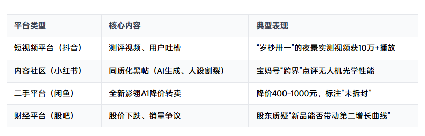 Ria Flow睿晰生成的报告还会把时间线梳理得明明白白,让你一目了然地看到事件在哪个时间点突然爆发、在哪些平台之间流动、关键传播节点是什么。从分析中可以看出,影石的负面内容主要集中在抖音、小红书、二手平台和股吧,而且不同平台的内容特点不同,抖音主要是测评视频,小红书则是大量同质化“黑帖”。